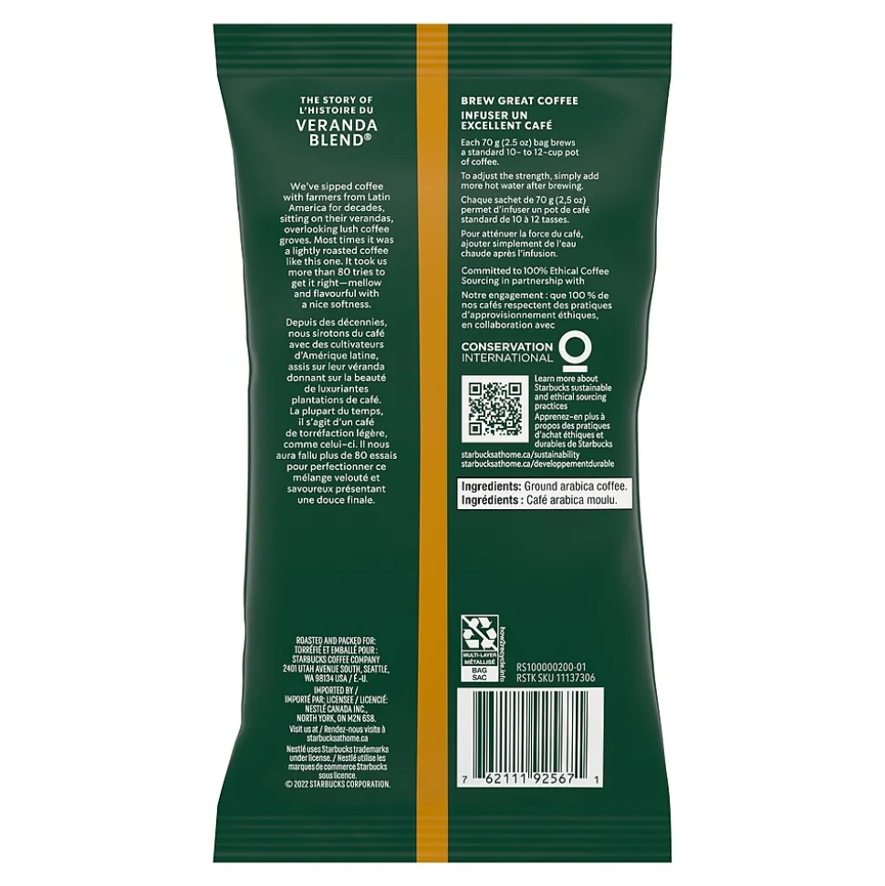 Starbucks Veranda Blend Ground Coffee, Blonde Roast, 2.5 oz., 18/Box (11020676)