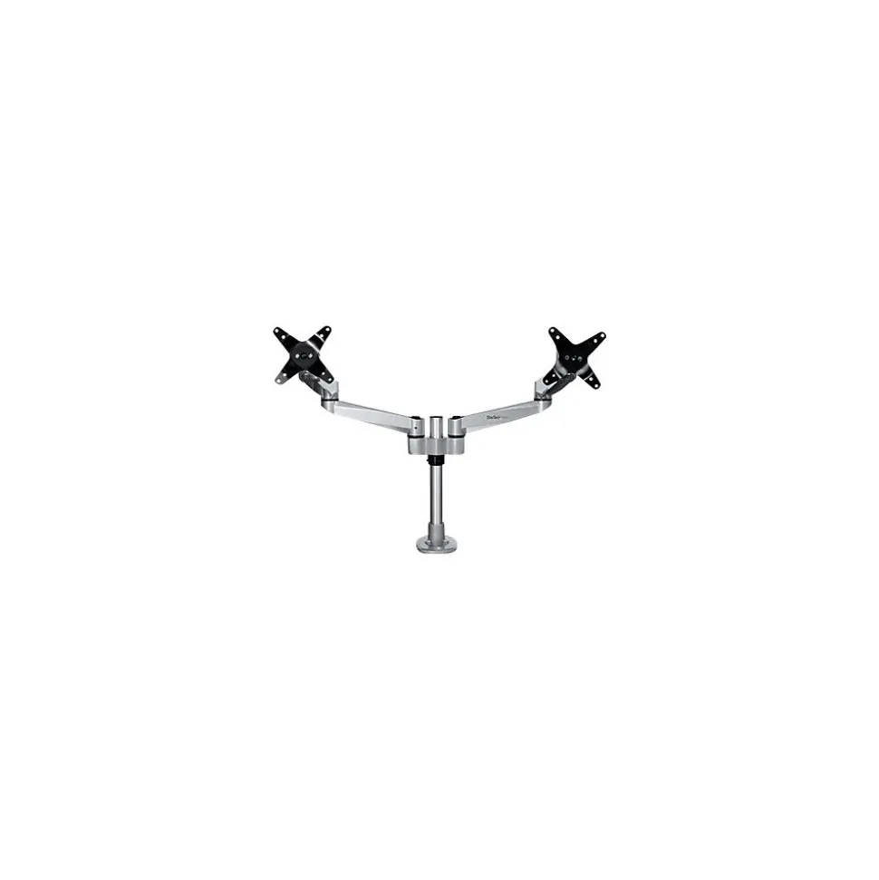 Monitor Mount Desk/Grommet Mount Tool-less Assembly For up to 27″ Monitors. Create an ergonomic workspace with this premium desk-mount dual monitor arm, for monitors up to 27″ each. The two articulating monitor arms with dual-swivel action offer a wide range of motion side to side. The attractive silver finish enhances the aesthetics of your workspace. Enjoy a Wide Range of Motion to Work in Comfort The dual articulating monitor arms offer a wide range of motion on several axes. It provides effortless motion to adjust the position of your monitors. Sleek and Stable Aluminum Design The robust aluminum design provides stable support for your monitors. The computer-monitor desk mount supports two VESA mount monitors (75×75, 100×100) with a weight capacity of up to 22 lb. (10 kg) per display. The cable-management channel helps to keep your workstation neat and tidy. Adjust your Viewing Angle Share your screen with ease. The double monitor mount offers a full +180-degree / -180-degree pan, to move your screen left or right. It tilts freely +90 / -15 degrees to adjust the angle up or down. Rotate your screens for landscape or portrait viewing. Height Adjustment Work in comfort. This height-adjustable monitor mount lets you raise or lower the monitor arms along the pole, with a range of up to 6.3″ (160 mm) Tool-less Assembly The fully assembled desk clamp and pole, plus quick slide-and-click connections, ensure easy assembly. It also saves time when setting up multiple units. The dual-screen mount gives you the option of desk clamp or grommet hole mounting (hardware included). The TAA compliant ARMDUALPS is backed by a StarTech.com 10-year warranty and free lifetime technical support.