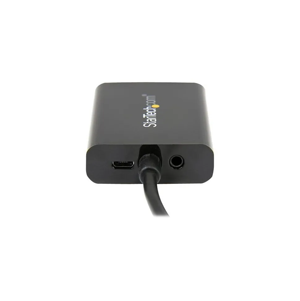 StarTech.comĀ® HDMI to VGA Adapter converter in black color connects HDMI equipments such as desktop, laptop or ultrabook with a VGA monitor. The 2-channel audio output delivers precision sound from an audio source. Adapter enclosure is made of rigid plastic to provide durability. Adapter converter comes with HDMI male as well as USB Micro-B female connector at one side and VGA female as well as 3.5 mm mini-jack female connectors at other end. Compact lightweight design of the adapter converter makes it easy to use and install. Suitable for video/audio presentation on monitor in boardrooms, hotel rooms, office and home.