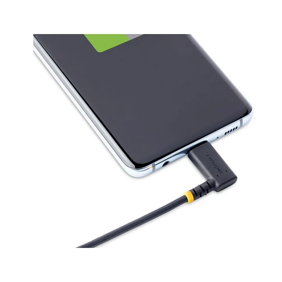 - Black 1ft USB-A to USB-C charging cable features right angle C connector that reduces strain on the port and allows cable to run flush with device