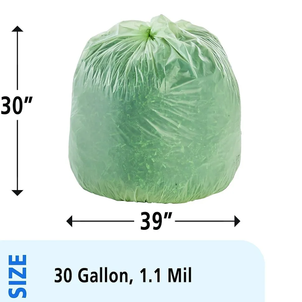 Implement a responsible waste disposal program with these 30-gallon bags. The bags comply with ASTM D6400 guidelines and can be used to line trash cans for secure disposal. Stout EcoSafe-6400 bags come 48 per box, making them convenient for home or small business use.