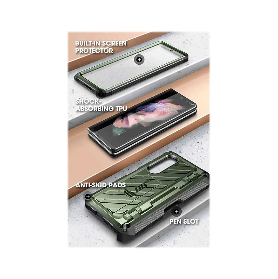 The SUPCASE Unicorn Beetle PRO rugged case ensures 360-degree full-body protection for your Samsung Galaxy Z Fold4 (2022). Features a built-in screen protector. Hinge protection doubles as S Pen holder. Exceeds military drop standards: drop-tested at 48″ height, 26 times.