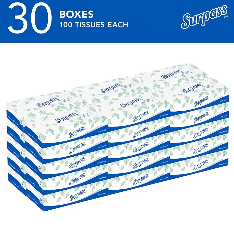 - 100 Tissues/Box, 30 Surpass® Facial Tissue Boxes/Case; 3,000 Tissues/Case; 2-Ply, White; Ecologo; Flat Facial Tissue Boxes for Business