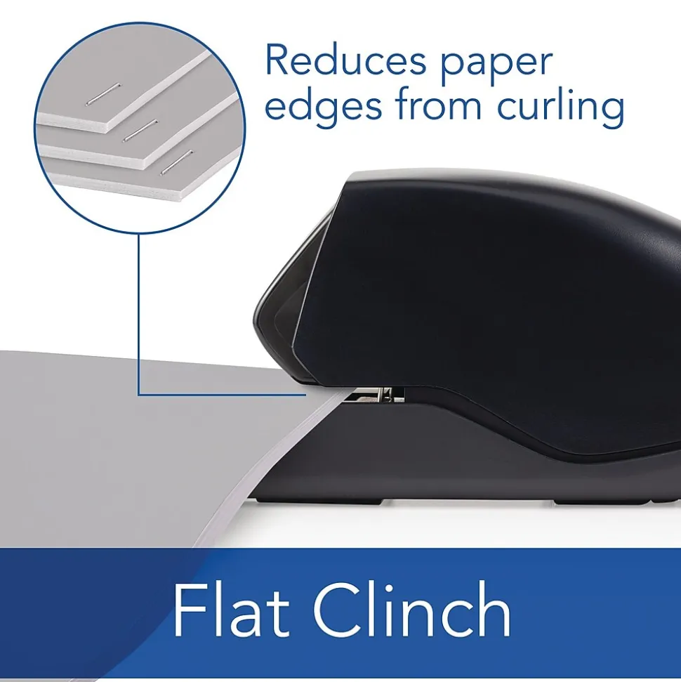 An effortless electric stapler with patented cartridge stapling technology that staples up to 25 sheets. Staple 1,500 times before having to replace the staple cartridge. With Flat clinch, the staples legs are flattened versus rounded (like traditional stapling) so when stapled pages are stacked – they lay flatter.