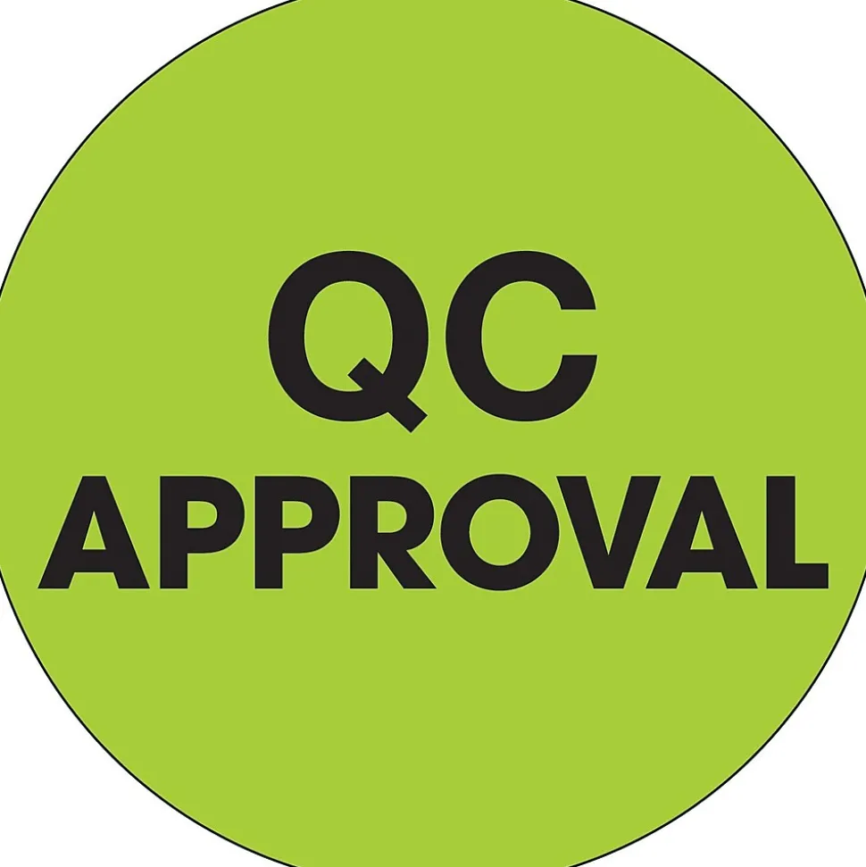 Tape Logicâ„¢ 1″ “QC Approval” Labelin fluorescent green color is printed with black color text. Label in circular shape has pressure sensitive adhesive for quick attachment on any surface, sold as 500 per roll.