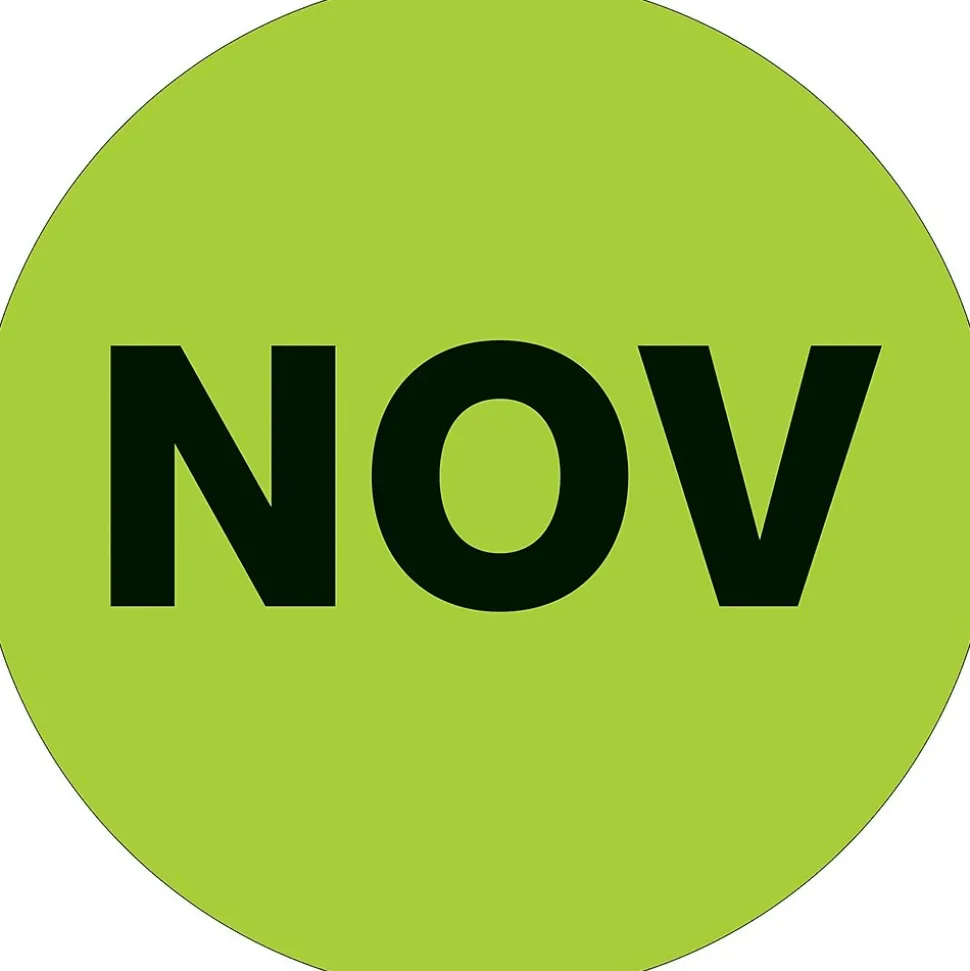 Tape Logicâ„¢ 2″ “NOV” Months of the year label in fluorescent green color is printed with black color text. Label in circular shape has pressure sensitive adhesive for quick attachment on any surface, sold as 500 per roll.
