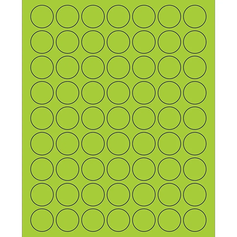 1″ Fluorescent Green Circle Laser Labels. Use to create your own product or mailing labels. Labels work with both Laser and ink jet printers. Permanent adhesive. Labels stick to a variety of smooth surfaces including paper, corrugated, plastic, wood, glass and metal.