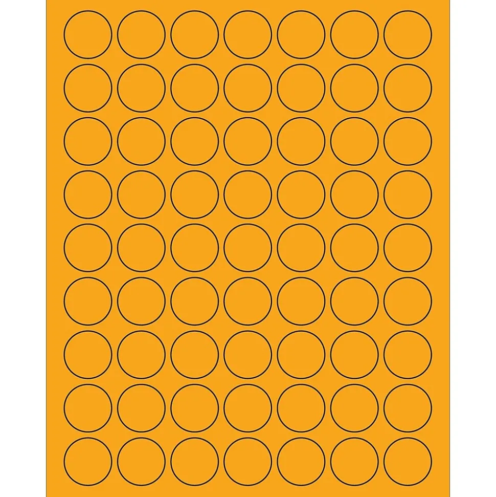1″ Fluorescent Orange Circle Laser Labels. Use to create your own product or mailing labels. Labels work with both Laser and ink jet printers. Permanent adhesive. Labels stick to a variety of smooth surfaces including paper, corrugated, plastic, wood, glass and metal.