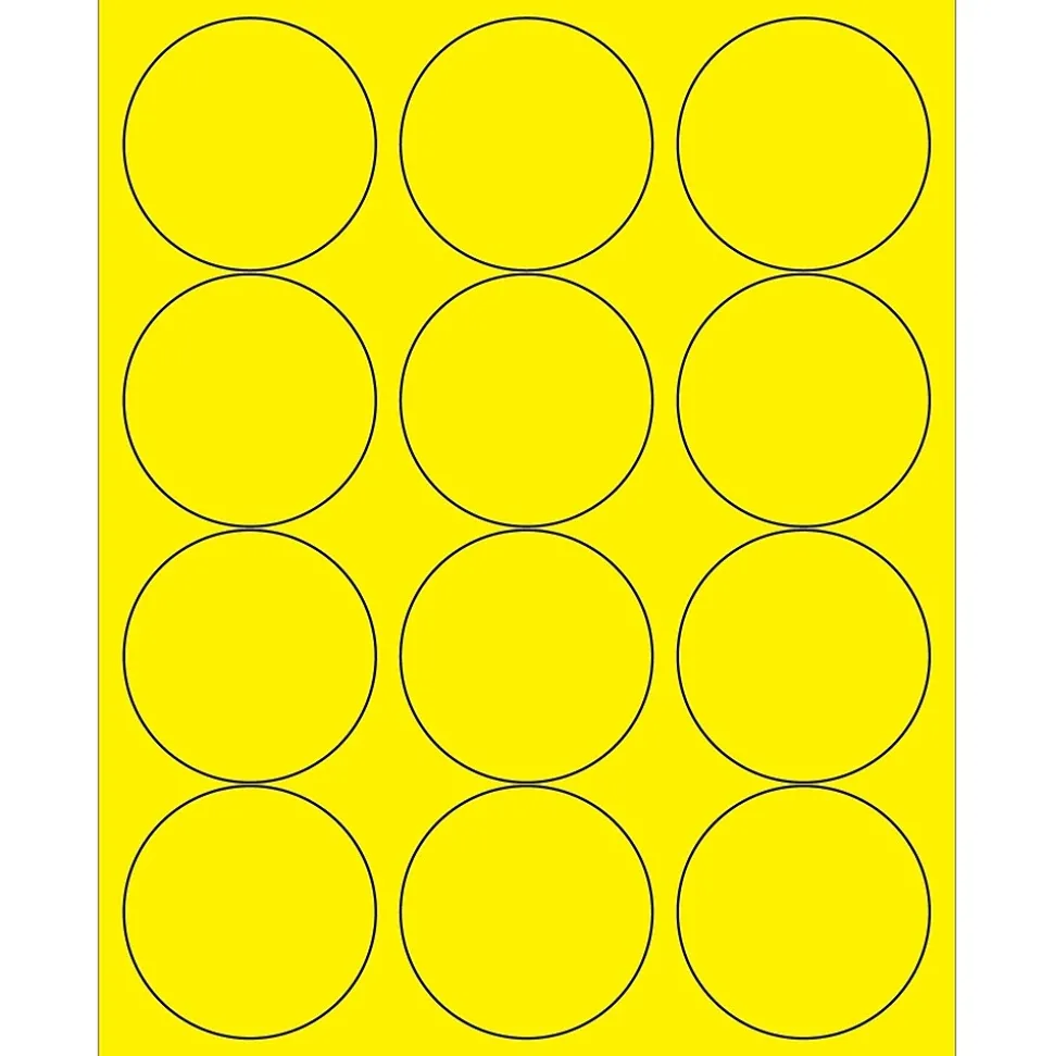 2 1/2″ Fluorescent Yellow Circle Laser Labels. Use to create your own product or mailing labels. Labels work with both Laser and ink jet printers. Permanent adhesive. Labels stick to a variety of smooth surfaces including paper, corrugated, plastic, wood, glass and metal.
