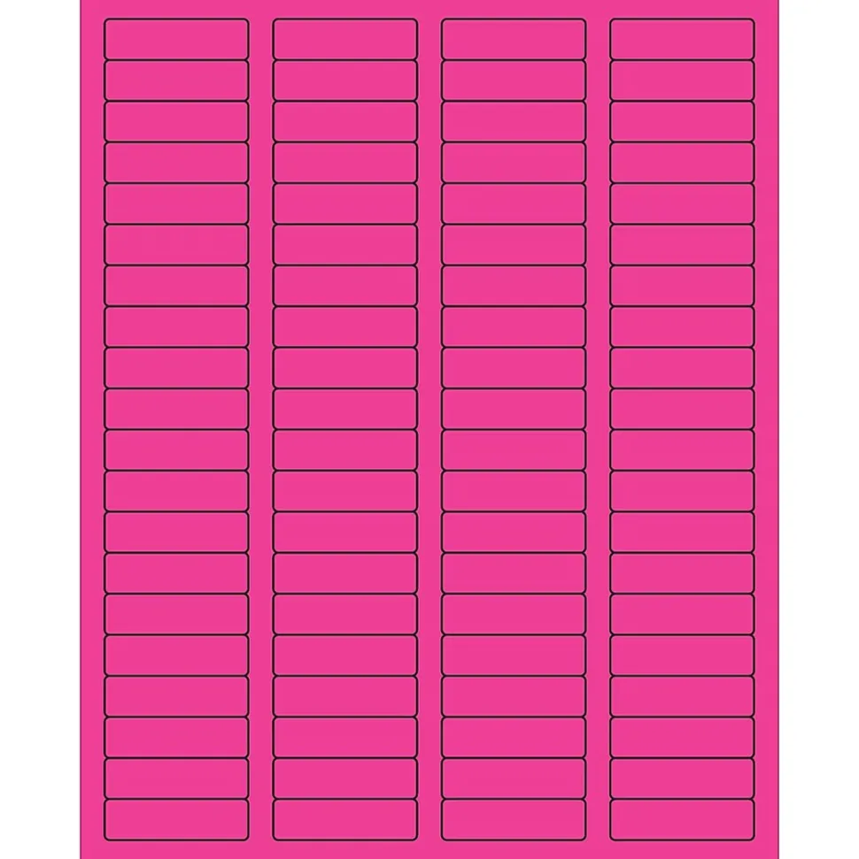 1 3/4″ x 1/2″ Fluorescent Pink Rectangle Laser Labels. Use to create your own product or mailing labels. Labels work with both Laser and ink jet printers. Permanent adhesive. Labels stick to a variety of smooth surfaces including paper, corrugated, plastic, wood, glass and metal.