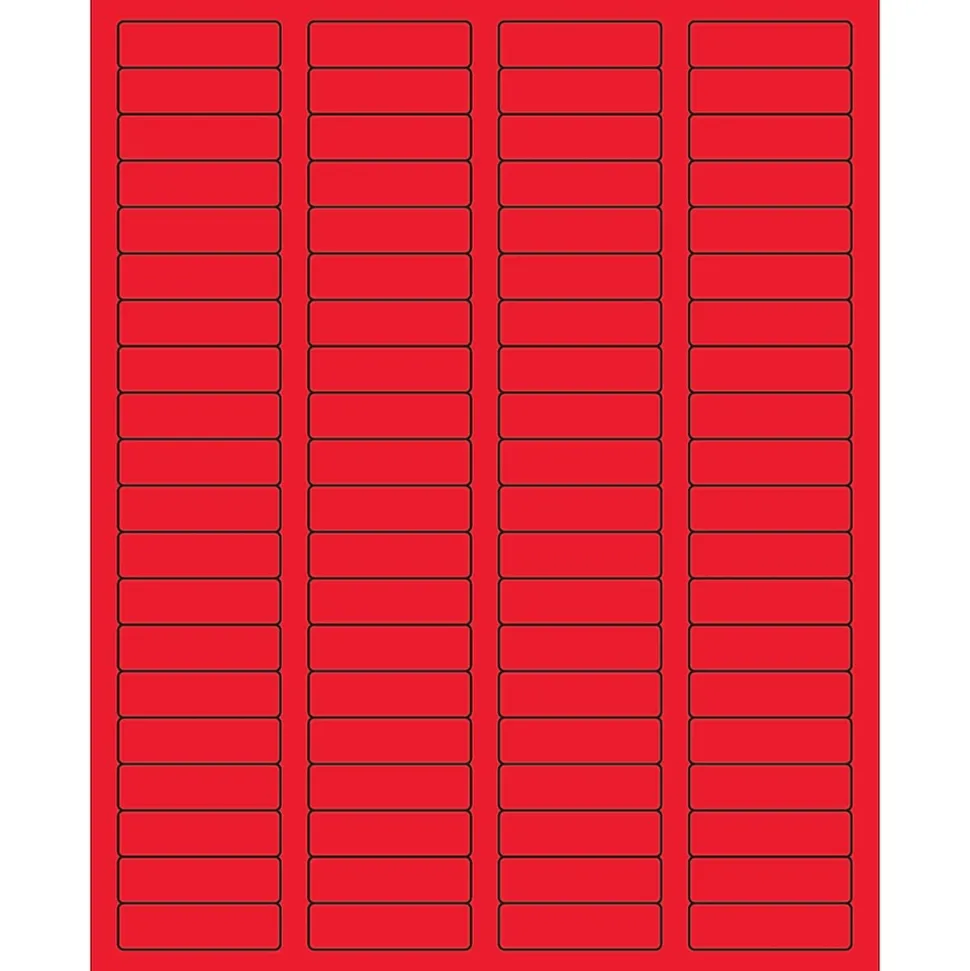 1 3/4″ x 1/2″ Fluorescent Red Rectangle Laser Labels. Use to create your own product or mailing labels. Labels work with both Laser and ink jet printers. Permanent adhesive. Labels stick to a variety of smooth surfaces including paper, corrugated, plastic, wood, glass and metal.