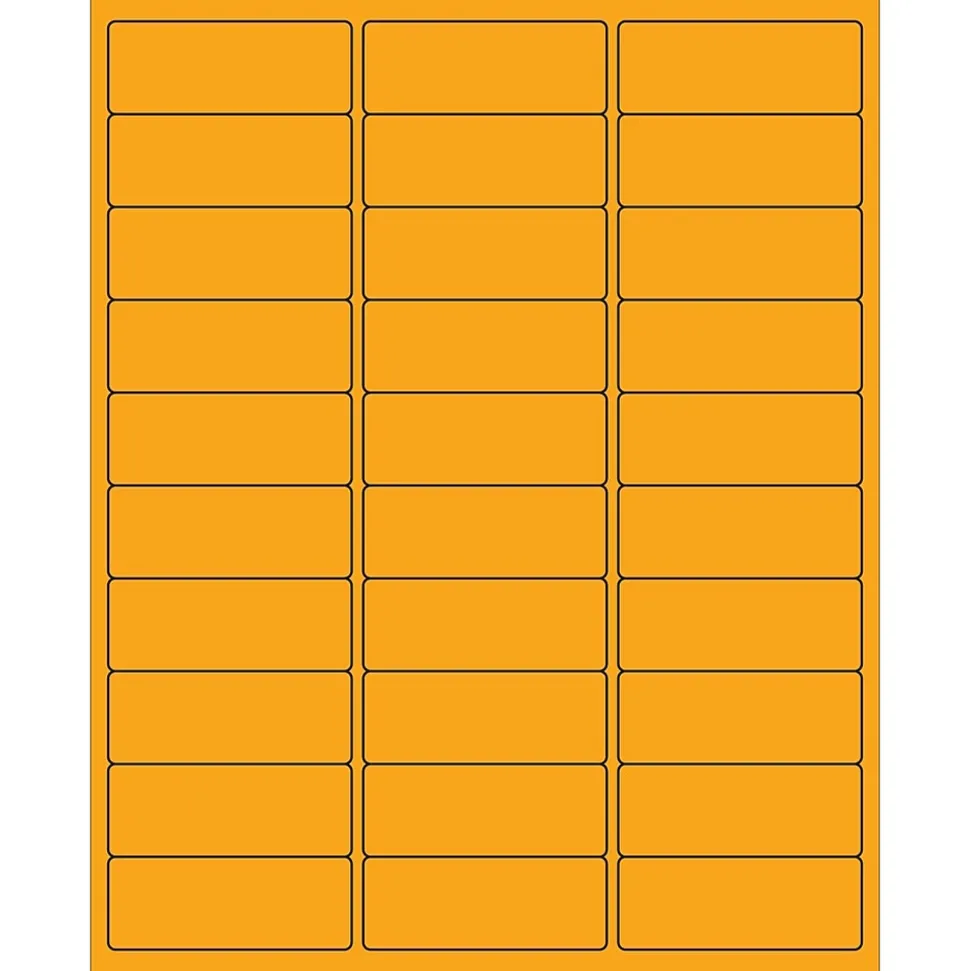 2 5/8″ x 1″ Fluorescent Orange Rectangle Laser Labels. Use to create your own product or mailing labels. Labels work with both Laser and ink jet printers. Permanent adhesive. Labels stick to a variety of smooth surfaces including paper, corrugated, plastic, wood, glass and metal.