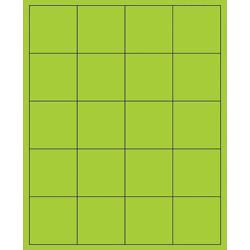 2″ x 2″ Fluorescent Green Rectangle Laser Labels. Use to create your own product or mailing labels. Labels work with both Laser and ink jet printers. Permanent adhesive. Labels stick to a variety of smooth surfaces including paper, corrugated, plastic, wood, glass and metal.