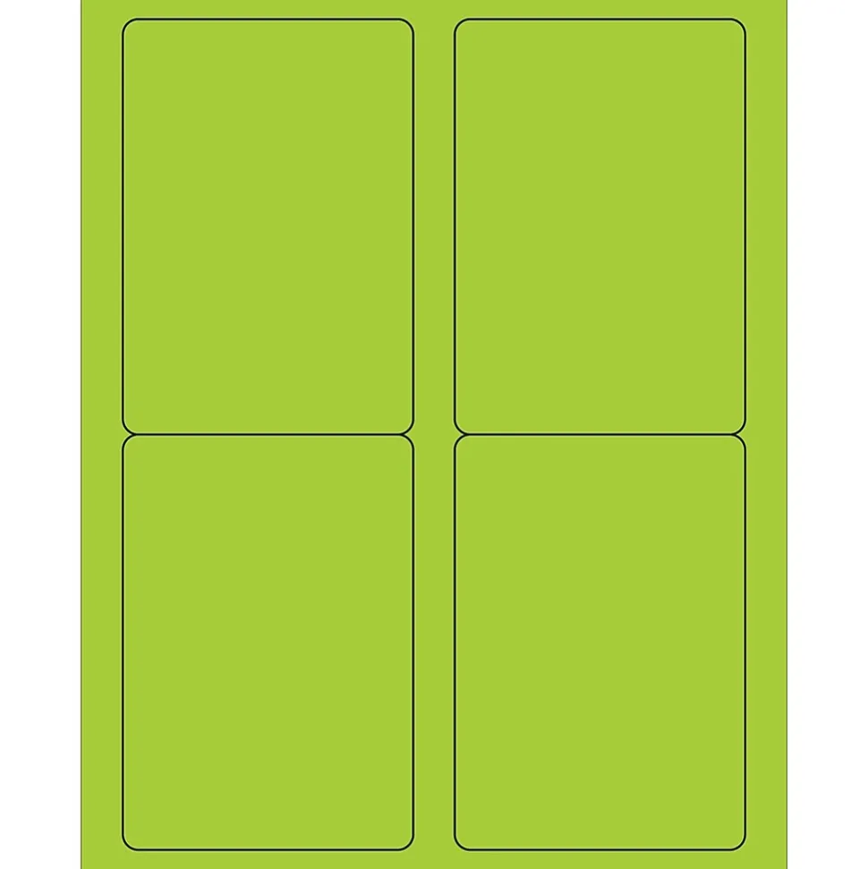 3 1/2″ x 5″ Green Rectangle Laser Labels. Use to create your own product or mailing labels. Labels work with both Laser and ink jet printers. Permanent adhesive. Labels stick to a variety of smooth surfaces including paper, corrugated, plastic, wood, glass and metal.