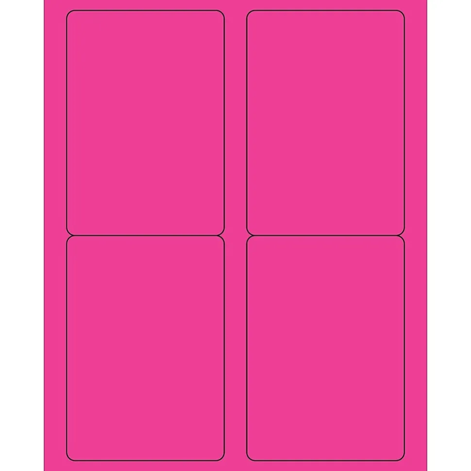 3 1/2″ x 5″ Fluorescent Pink Rectangle Laser Labels. Use to create your own product or mailing labels. Labels work with both Laser and ink jet printers. Permanent adhesive. Labels stick to a variety of smooth surfaces including paper, corrugated, plastic, wood, glass and metal.