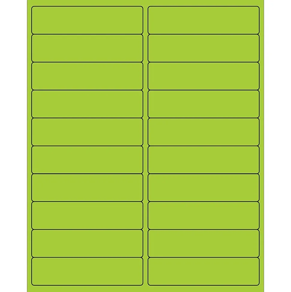 4″ x 1″ Fluorescent Green Rectangle Laser Labels. Use to create your own product or mailing labels. Labels work with both Laser and ink jet printers. Permanent adhesive. Labels stick to a variety of smooth surfaces including paper, corrugated, plastic, wood, glass and metal.