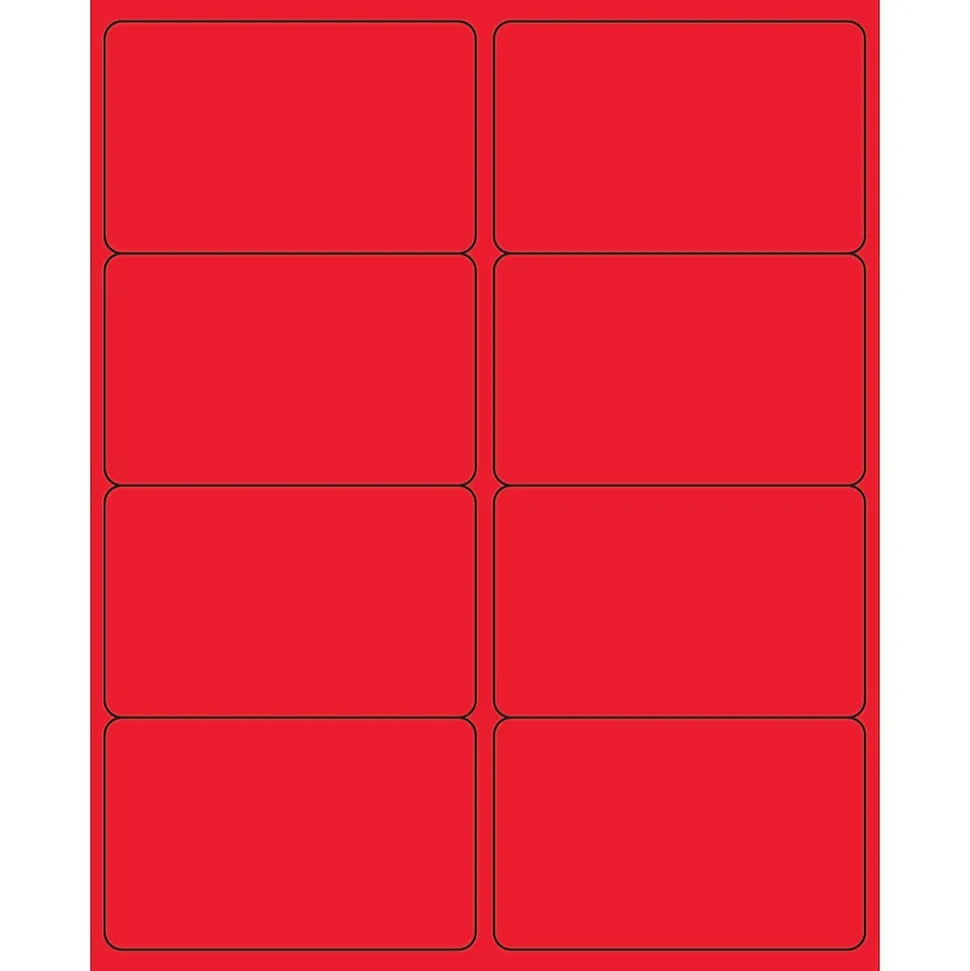 4″ x 2 1/2″ Fluorescent Red Rectangle Laser Labels. Use to create your own product or mailing labels. Labels work with both Laser and ink jet printers. Permanent adhesive. Labels stick to a variety of smooth surfaces including paper, corrugated, plastic, wood, glass and metal.