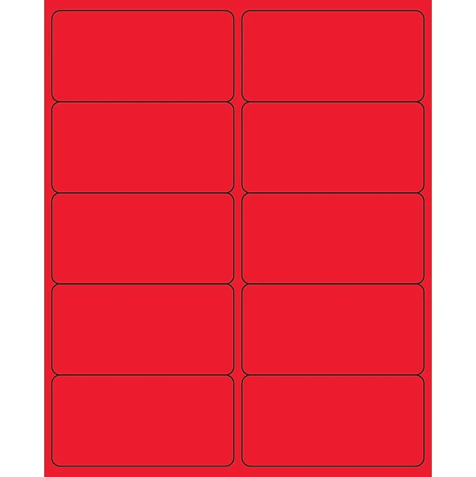 4″ x 2″ Fluorescent Red Rectangle Laser Labels. Use to create your own product or mailing labels. Labels work with both Laser and ink jet printers. Permanent adhesive. Labels stick to a variety of smooth surfaces including paper, corrugated, plastic, wood, glass and metal.