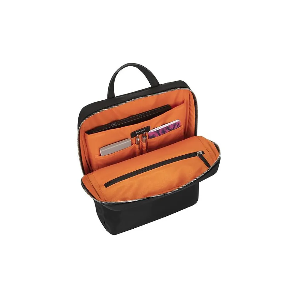 Whether you’re looking for a traveling or work companion, the 15″ Targus Newport ultraslim backpack fits the bill. It wouldn’t be out of place strolling down brownstone-lined streets or beach neighborhoods, and doubles as a small backpack for your work accessories. Designed to fit slim laptops or tablets, the backpack offers enough room for your everyday essentials. With its front and back quick-access pockets and tuck-away shoulder straps that convert the backpack to a handheld tote, this slim, sleek case is the perfect pack for those constantly on the go. To accommodate different carrying preferences, padded adjustable shoulder straps and a top handle have also been added for extra convenience in day-to-day commuting or no-frills short getaways. For those who frequently travel for work or simply need a handy bag for a leisure getaway, the pack can easily be attached to rolling luggage with a luggage strap for a weightless carry.