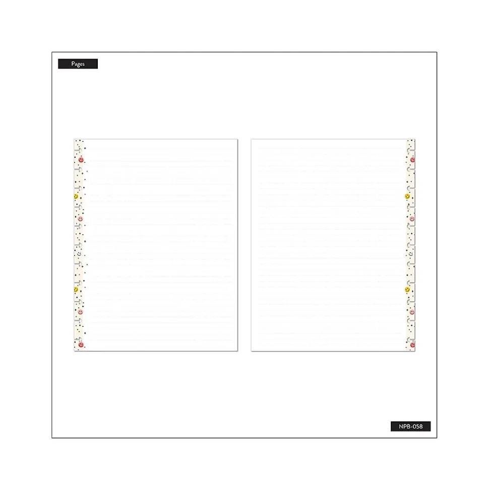 - Features a sturdy laminated cover in beige with a Happy Brights design featuring smiley faces and colorful confetti
