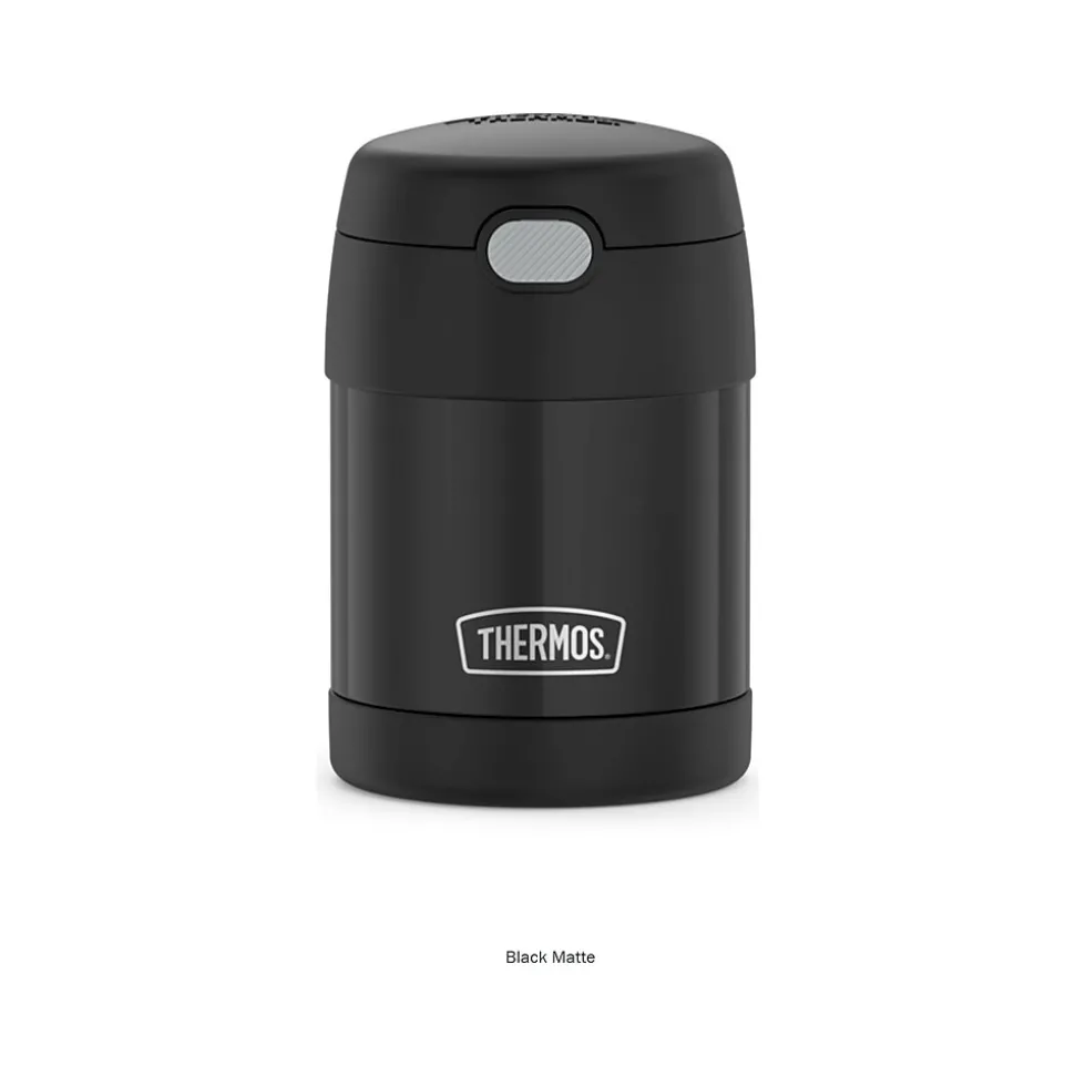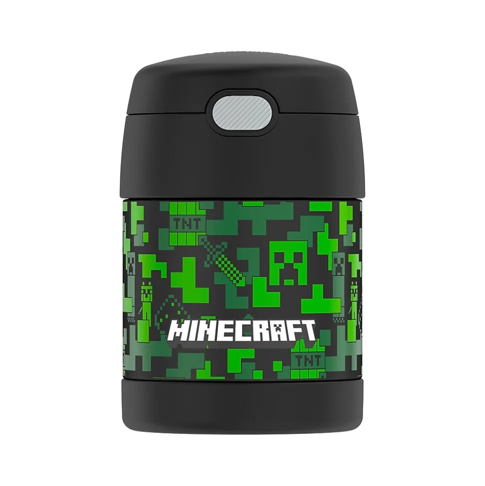 The Thermos FUNtainer 10 oz. food jar is the perfect lunch packing companion. The vacuum insulation and stainless steel construction contribute to maximum temperature retention and durability while ensuring freshness and safety of products within. The Thermos FUNtainer food jar keeps food hot for five hours and cold for seven. A folding spoon sits in the push-button lid compartment. Unscrew the entire lid to open the food compartment, which has a large opening, making it perfect to eat from as well making it easy to clean. This assortment offers navy blue, black or Minecraft food jars.