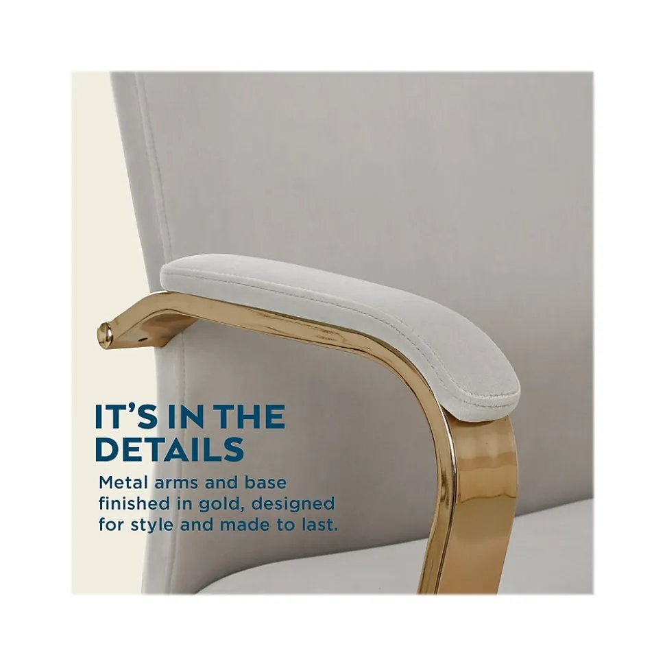 - Features a soft, velvety microsuede fabric upholstery in light gray with metal arms and a heavy-duty metal base in gold-tone plating