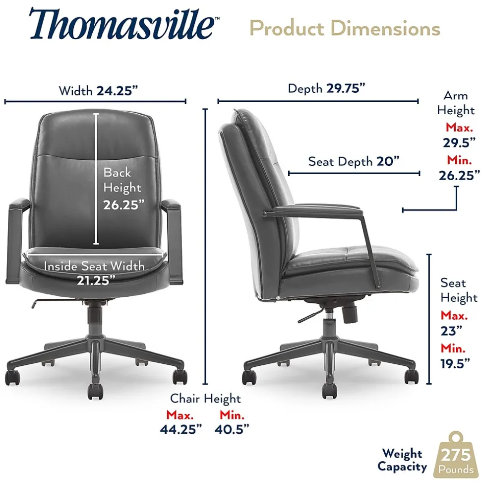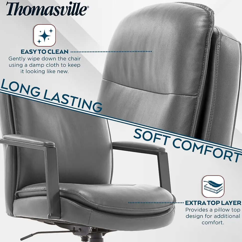 Featuring plush cushioning, clean lines, and a tailored silhouette, the Thomasville Furniture Upton bonded leather office chair is an inviting blend of comfort and style. With handsome bonded leather upholstery on the seating surface and a sturdy metal base, this home office chair is well-suited to a range of decors. Ergonomic and adjustable, this modern desk chair is fitted with a pneumatic lift mechanism to control the height, tilt, and lift for optimized body alignment. The dual-layer design provides a soft top pillow layer formed over a durable, reinforced structural back layer for lasting comfort and support. Finished with sturdy rolling wheels, this executive office chair allows you to move quickly and efficiently around your office space.