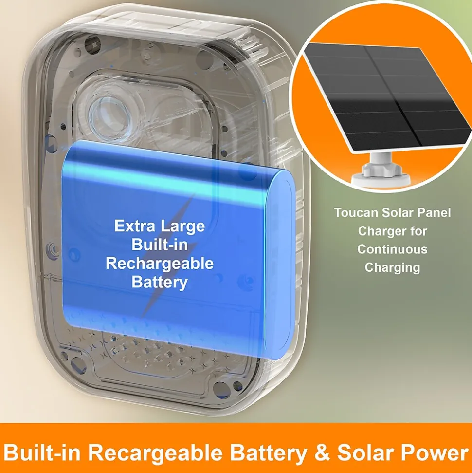 - Built-in 9,750 mAh rechargeable battery allows wire-free easy set up almost anywhere, optional plug-in for continuous power, optional Toucan solar panel charger for continuous charging