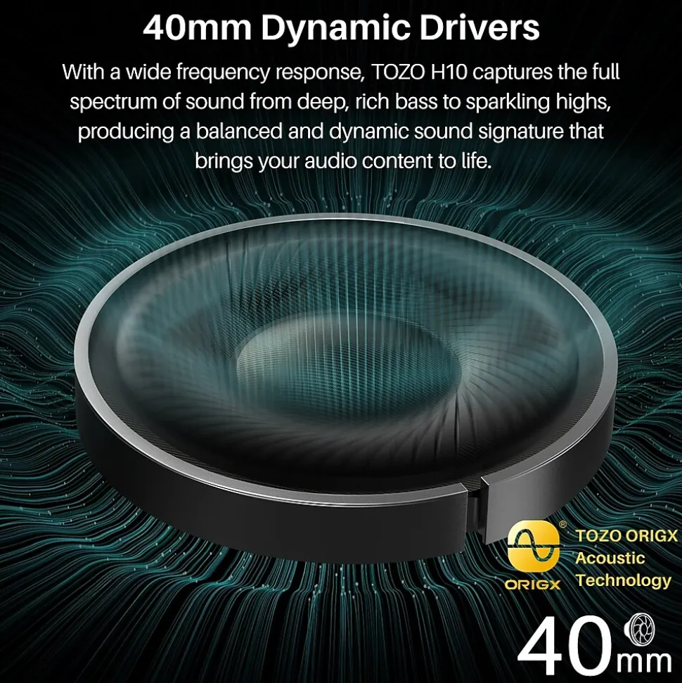 Presenting the TOZO H10 Headphones: Immerse yourself in an extraordinary audio adventure with pristine sound quality in any environment. Seamlessly stay connected with crystal-clear calls every time. The 40mm Dynamic Driver Units provide an immersive sound experience, complemented by Hi-Res Audio Certification for audio quality that exceeds expectations.