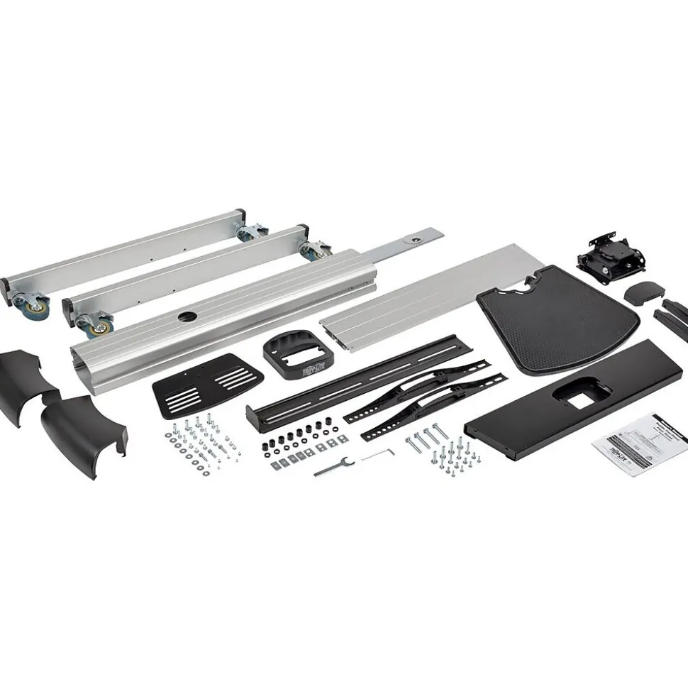 Overview The DMCS3270XP Mobile Flat-Panel Floor Stand allows you to mount a flat-panel television, monitor or other display and move it from room to room for best viewing or against a wall out of the way when not in use. Recommended for classrooms, lecture halls, offices, auditoriums and conference rooms, the height-adjustable mobile stand fits most flat-panel displays from 32 to 70 inches. You can adjust the DMCS3270XP’s height from 47 to 81.5 inches. You can also rotate the display for viewing in portrait or landscape modes. Roll the unit with little effort to the proper viewing location and angle on sturdy four-inch swivel casters that move smoothly through doorways and over thresholds. All four casters lock to keep the stand securely in position. A shelf mounted above the display holds projectors, webcams and laptops. A lower shelf holds other audio/video components, such as a Blu-ray player. Durable aluminum and steel construction supports up to 110 lb. The adapter brackets can be adjusted to conform to VESA-compliant displays with any of the following mounting hole patterns: 200 x 200, 300 x 300, 400 x 200, 400 x 400 and 600 x 400. Features Height-Adjustable Display Stand Rolls from Room to Room Mobile mount for flat-panel TVs, monitors and other displays. Recommended for classrooms, lecture halls, offices, auditoriums and conference rooms. Fits most flat-panel displays from 32 to 70 in. Flexible Features That Meet Your Specifications Height adjusts from 47 to 81.5 in. Rotates for viewing in portrait or landscape modes Rolls on Sturdy Metal Casters 4 in. swivel casters move smoothly through doorways and over thresholds. All casters lock to hold stand securely in position while at rest Durable Construction Made from aluminum and steel. Upper shelf holds projectors, webcams and laptops. Lower shelf holds A/V components, such as Blu-ray player. Supports up to 110 lb. VESA Compliance Supports the following VESA mounting hole patterns: 200 x 200, 300 x 300, 400 x 200, 400 x 400 and 600 x 400 Package Includes Middle base. Left leg. Right leg. Left cover. Right cover. Support plate. Universal plate. (2) Plastic covers. (2) Adapter brackets. Column. Plastic handle. Top cover. Connecting plate. Camera shelf. DVD shelf. (8) Washers. (4) M5 x 14 screws. (4) M6 x 14 screws. (4) M8 x 20 screws. (4) M6 x 30 screws. (4) M8 x 30 screws. (4) M8 x 50 screws. (8) M6 x 16 screws. (3) M6 x 25 screws. (7) M4 x 6 screws. (2) M6 x 14 screws. (6) M6 x 8 screws. (4) M8 x 25 screws. (2) M5 x 8 screws. (8) Small spacers. (8) Big spacers. Allen wrench. Wrench. Owner’s manual