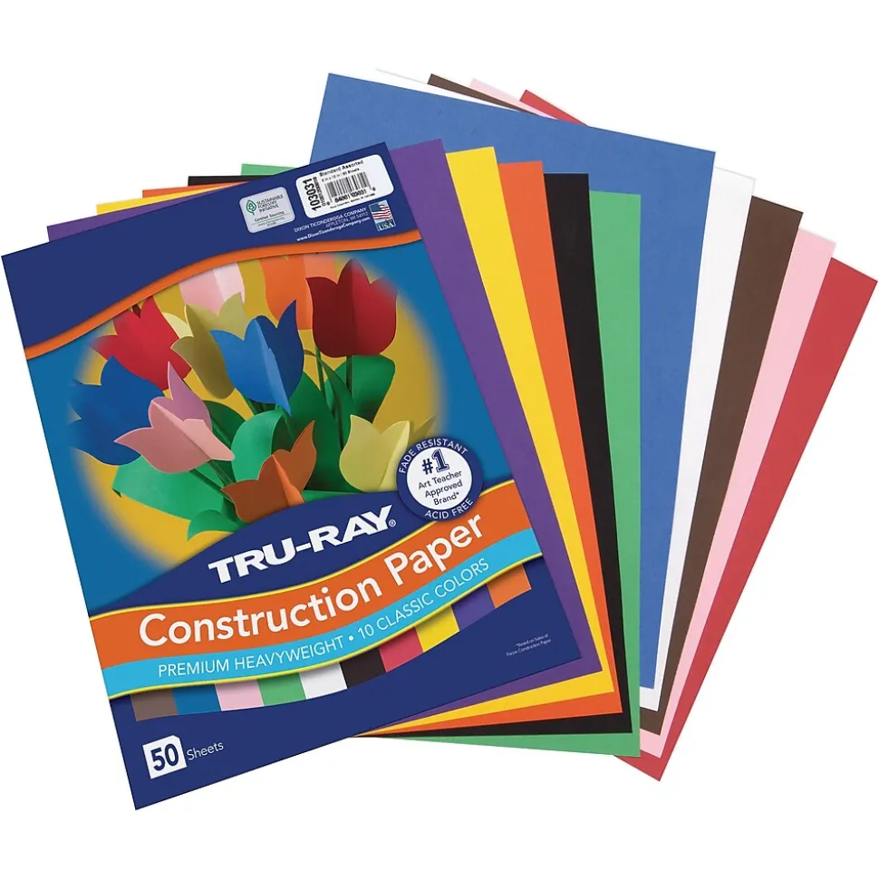 Heavyweight 100% vat-dyed sulphite with longer, stronger fibers. Tru-Ray® Construction Paper is tough enough to take scoring, folding and curling without cracking and tearing. Its superior fade-resistance keeps projects brighter and fresher longer. Colors include: White, Black, Orange, Yellow, Festive Green, Pink, Purple, Blue, Dark Brown, and Red. 50 sheets per package. Acid free for less fade. 50% recycled fiber content and recyclable.