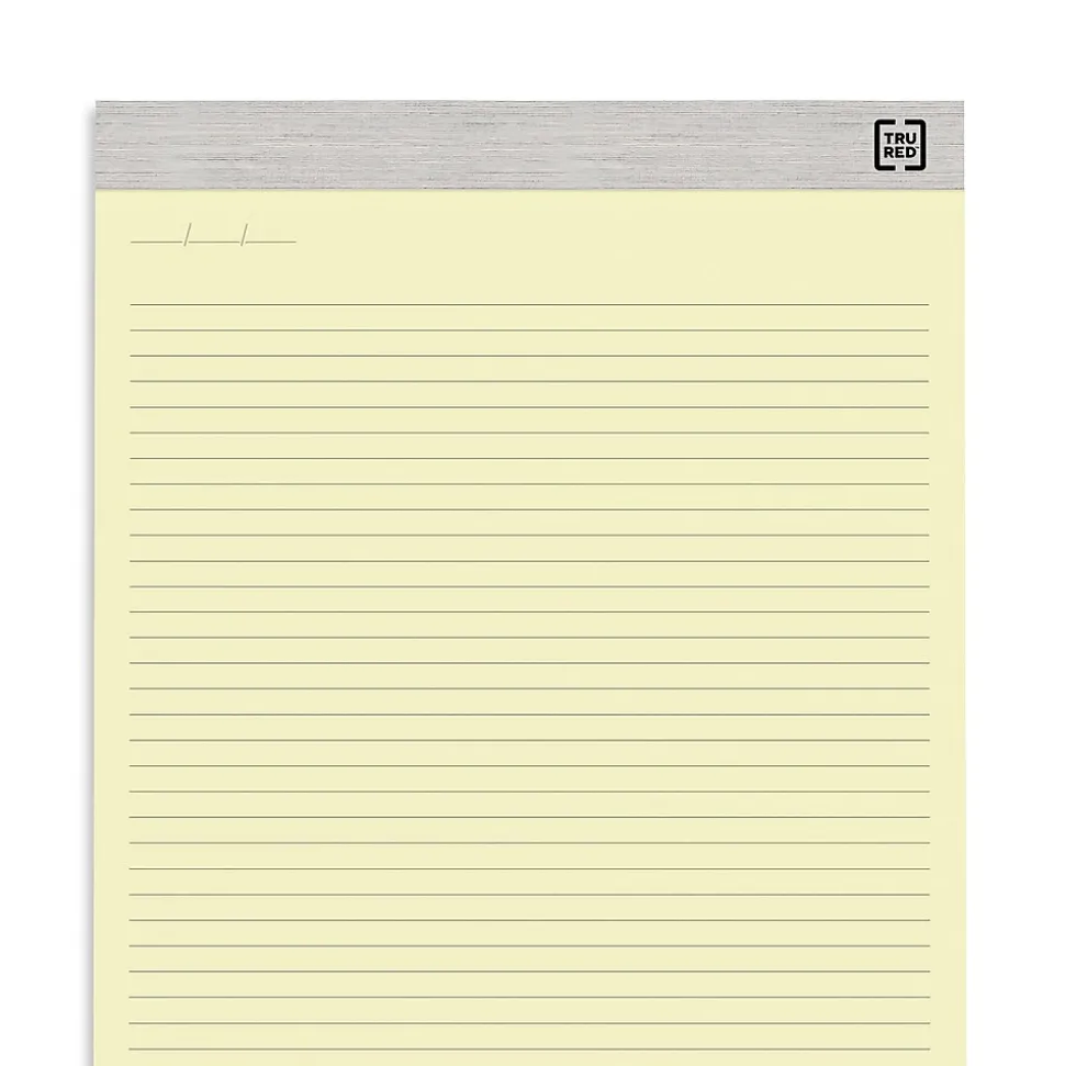 Support academic and data gathering activities with these 50-sheet canary heavyweight ruled notepads. The 60-point laminated backer and 20-pound paper weight offer substantial heft and deliver a professional look, while the top-bound design lets you quickly browse through the pages to find information. These TRU RED 8.5 x 14-inch canary heavyweight ruled notepads have wide ruling to help you produce neat readable text.