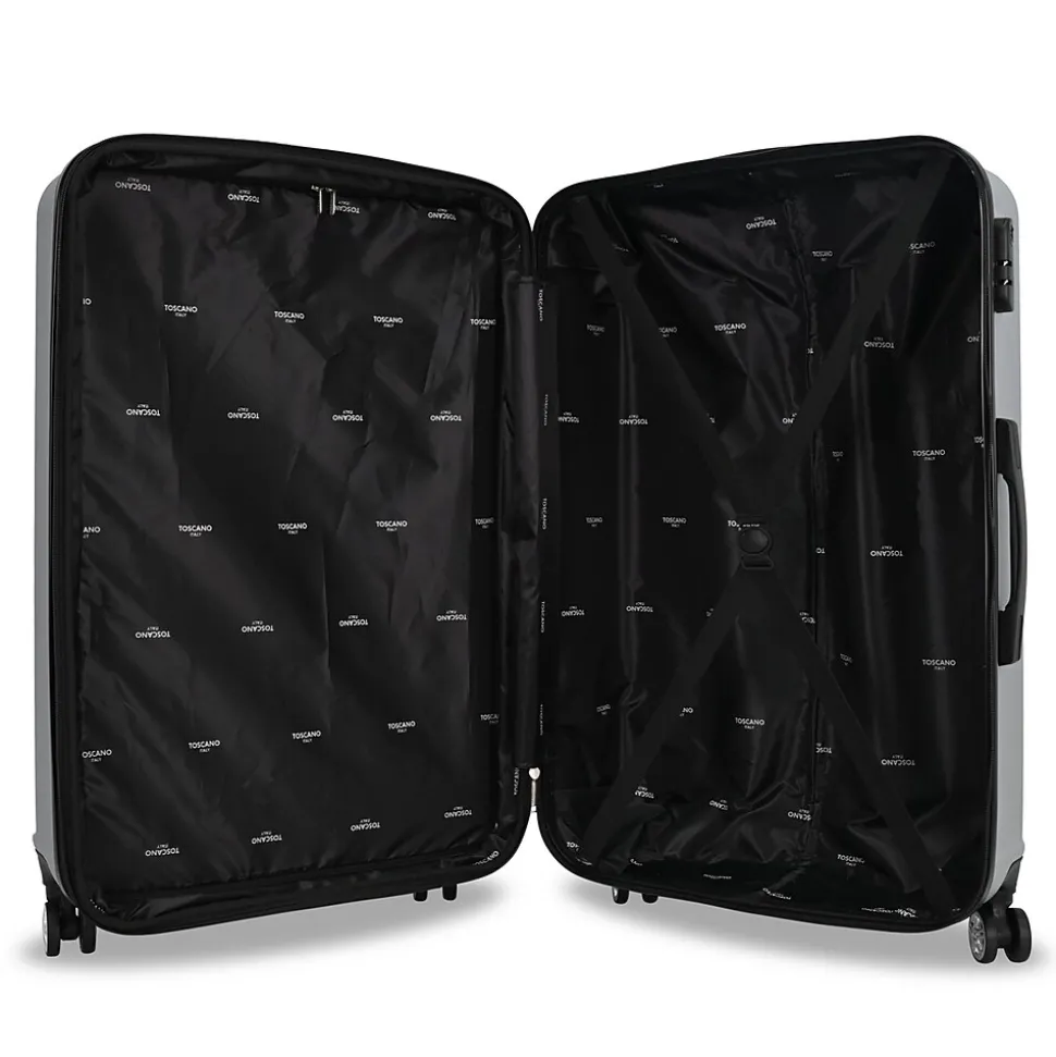 The Toscano Ottimo 2-Piece Luggage Set in Silver (S0536-02PC-SLV) offers a blend of modern style and dependable performance, making it a versatile choice for any traveler. This set includes a sleek carry-on and a spacious checked bag, each featuring a polished silver, scratch-resistant hard shell that combines elegance with durability.Constructed from lightweight yet sturdy materials, the Ottimo set ensures effortless mobility with 360-degree spinner wheels and an ergonomic telescoping handle for smooth handling. The interiors are thoughtfully designed, featuring Toscano’s signature deluxe lining, adjustable straps, and multiple compartments to keep belongings secure and organized. With a 2” expandable feature, this set provides additional packing space when needed, making it suitable for both short getaways and extended trips. The built-in combination lock adds an extra layer of security, while the soft handles offer comfortable grip.
