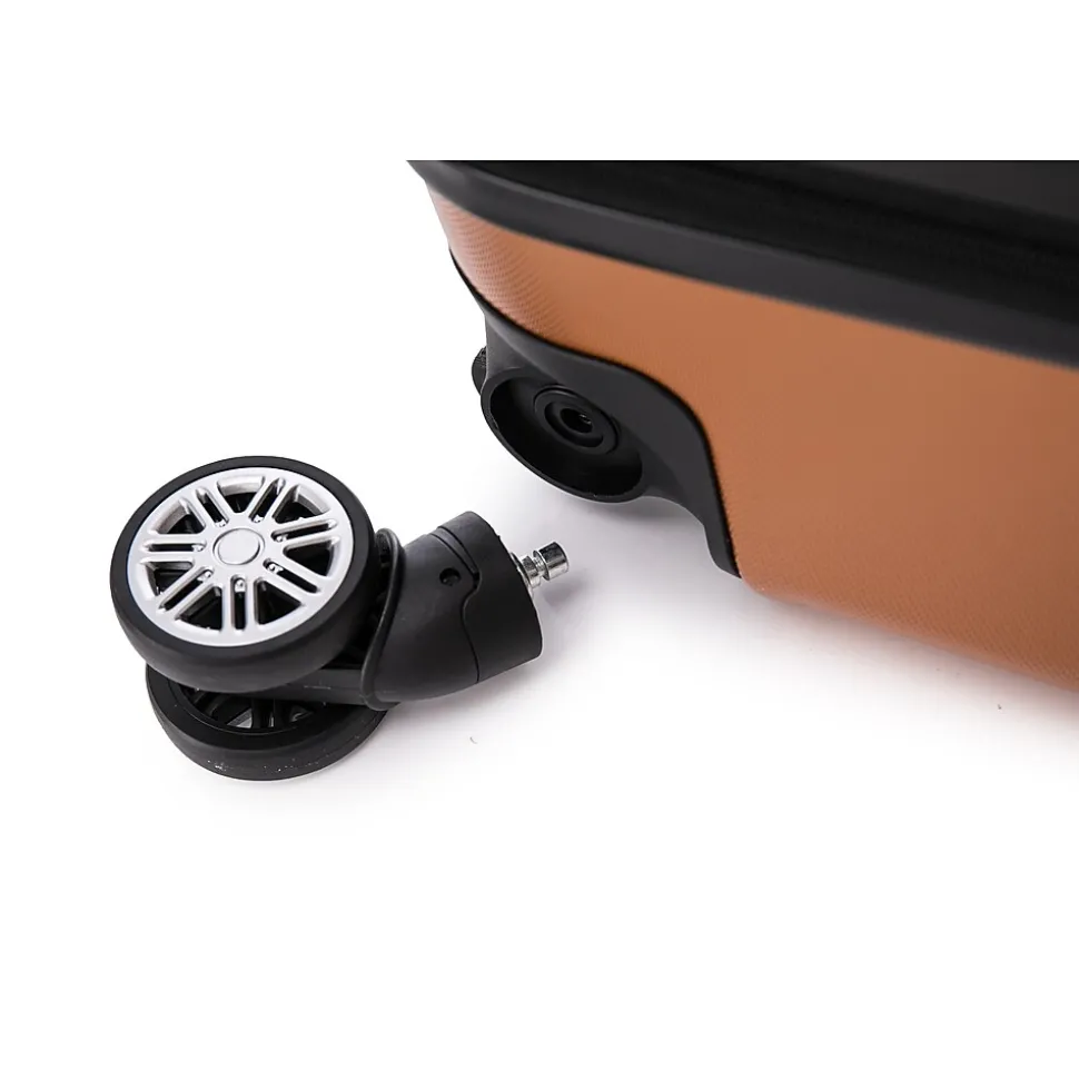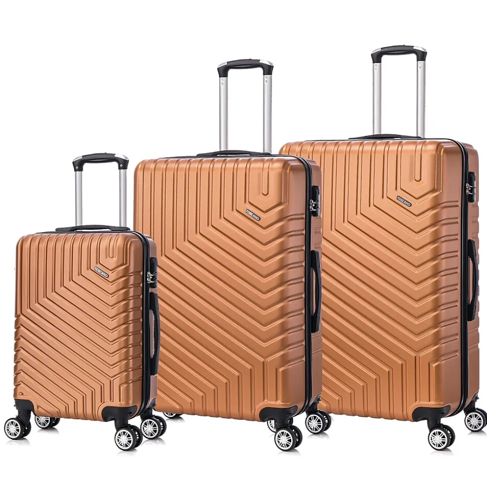 The Toscano Rigoroso 3-Piece Luggage Set in Bronze Gold (S0567-03PC-BRGL) offers a blend of luxury and durability, making it an ideal choice for travelers who appreciate sophisticated design. This set includes a carry-on, a medium-sized suitcase, and a large checked bag, all showcasing an elegant bronze-gold finish with a scratch-resistant hard shell for lasting protection and a touch of opulence.Constructed from lightweight yet resilient materials, the Rigoroso set ensures seamless travel with 360-degree spinner wheels and an ergonomic telescoping handle for effortless mobility. The interiors are spacious and thoughtfully designed, featuring adjustable straps and multiple compartments for organized packing. With a 2″ expandable feature, the set allows for up to 35% more packing capacity, perfect for accommodating extra items. It also includes a built-in combination lock for added security and soft jelly handle grips for comfortable handling.Combining bold design with practical functionality, the Toscano Rigoroso set in Bronze Gold is perfect for travelers who desire a refined, high-performance luggage set.