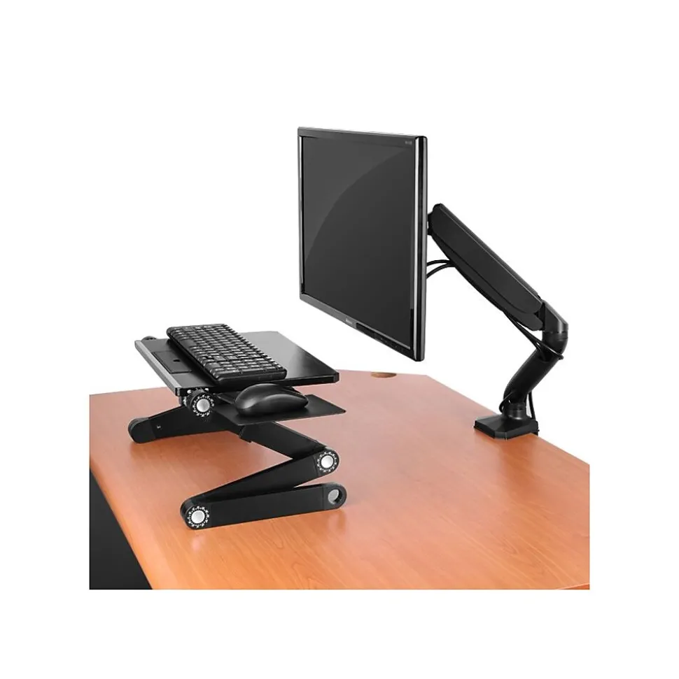 Perfectly position monitors at the optimal viewing angle with this durable, gas-spring Single Monitor Mount.EFFECTIVE Swivel, pan, tilt and raise monitors to a position that’s right for you. Adjustable tension knob accomodated different monitor weights.EASY INSTALLATION: Securely connects to your desk via simple screw clamp or grommet mount.Your back, neck & shoulders will thank you!