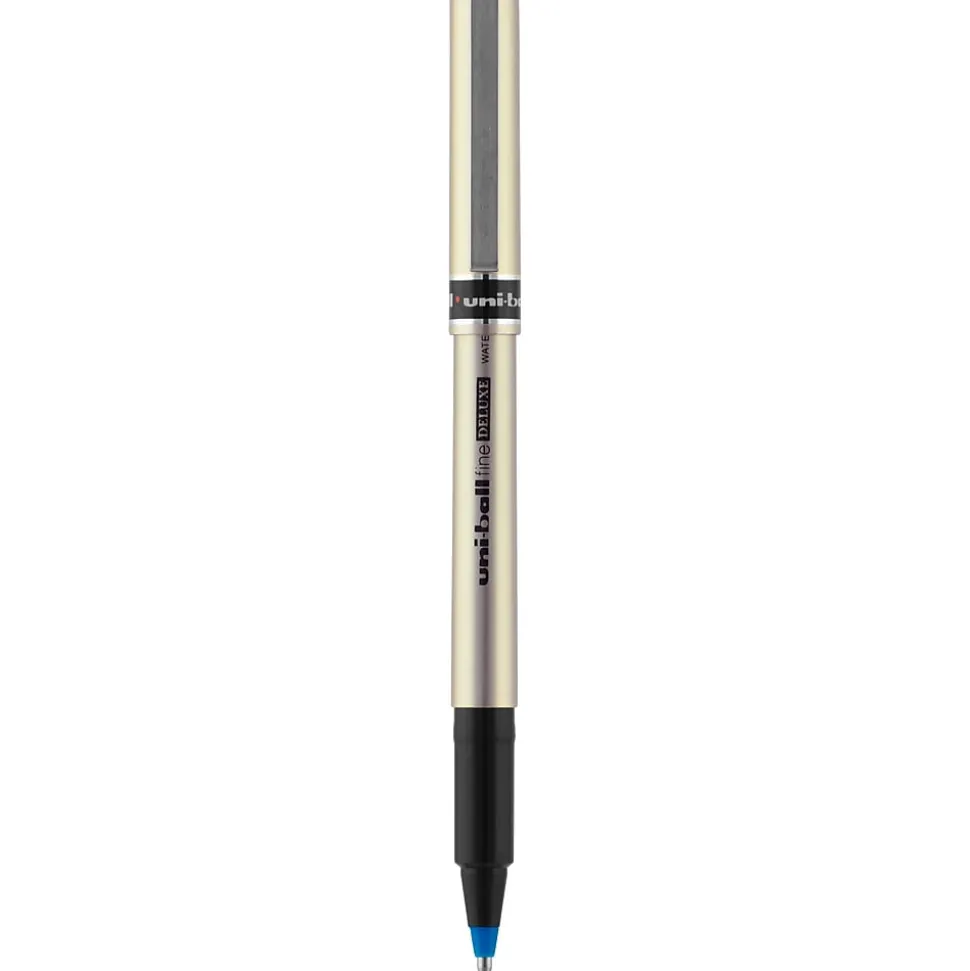 Introduce sophisticated style to your everyday writing with Deluxe Rollerball Stick Pens from uniball featuring a strong, long lasting 0.7mm fine tip. Even-flowing, acid-free liquid ink delivers a smooth writing experience for intense, vibrant lines. Fine point pens deliver crisp lines with unparalleled definition, making it easy to create super fine details in your drawings and diagrams. Capped roller pens are useful for a variety of tasks from note taking and list making to signing checks and legal documents. Innovative uni Super Ink technology forms a strong bond with the paper, protecting from water, fading and fraud. Up your writing instrument sophistication with the matte gold, brushed steel barrel of the Deluxe capped rollerball pens.