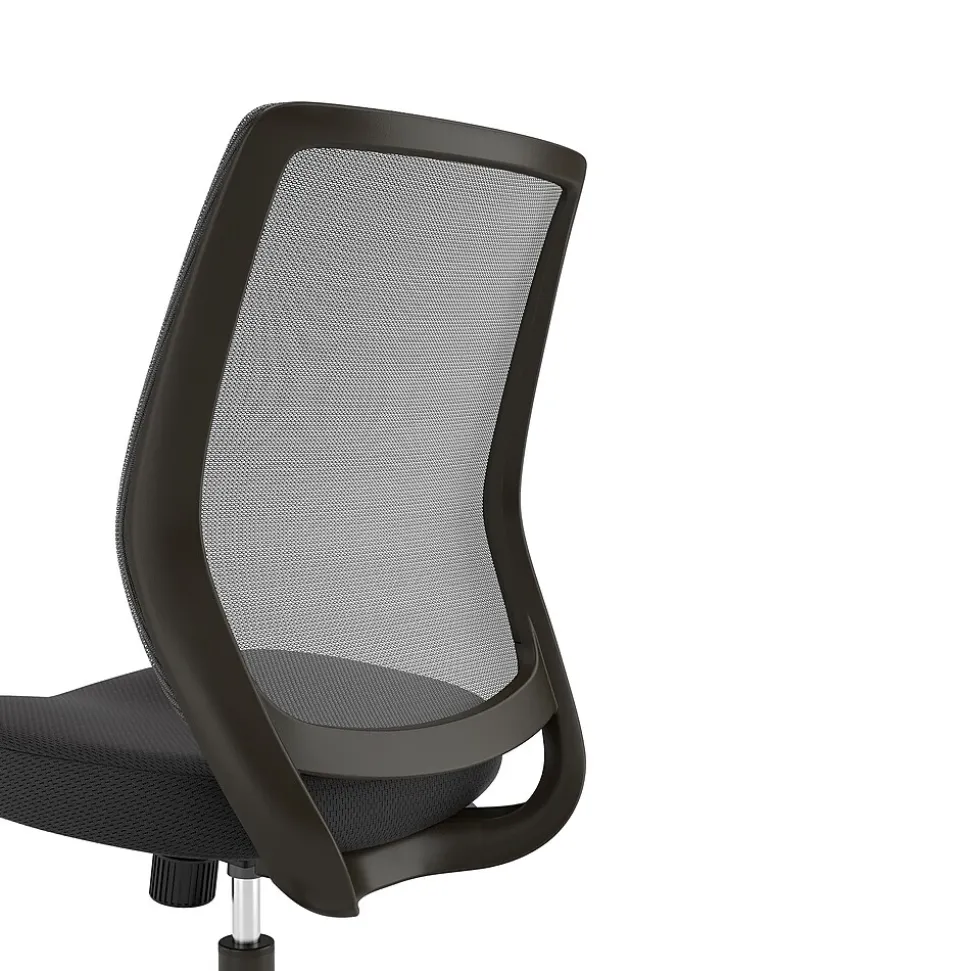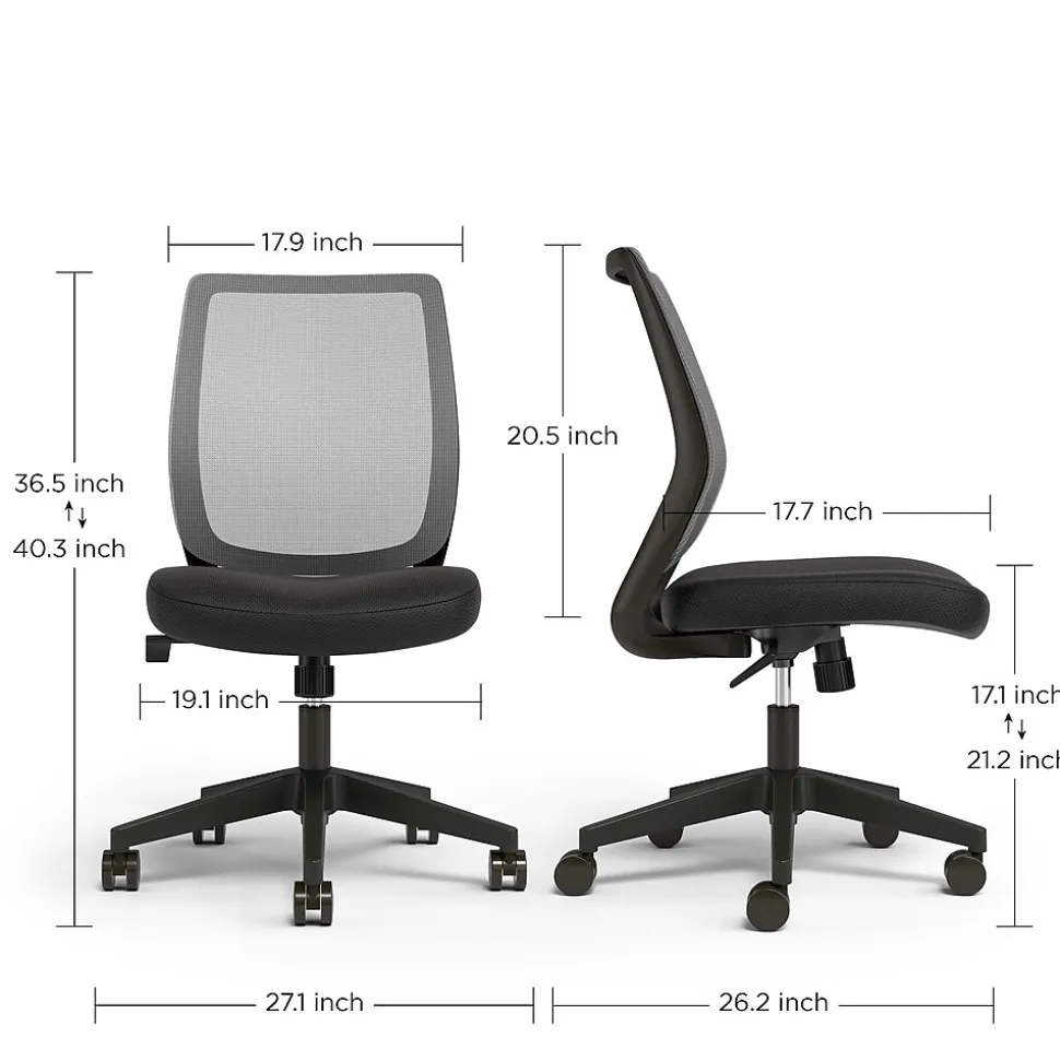 Set up an optimized ergonomic workstation with this armless mesh back fabric chair. The contoured seat and cushioned padding help absorb your weight and offer reliable support, while the mesh back promotes the flow of cooler air, releasing trapped heat. Calibrate the tilt resistance of the chair as you recline with the convenient tilt tension knob, and support proper posture with the adjustable seat height. An upright tilt lock lets you enable and disable the recline function easily, while the armless design means you can slide this seat under your desk to maximize office space. The five casters on this Essentials black mesh back fabric chair support effortless mobility throughout your office.