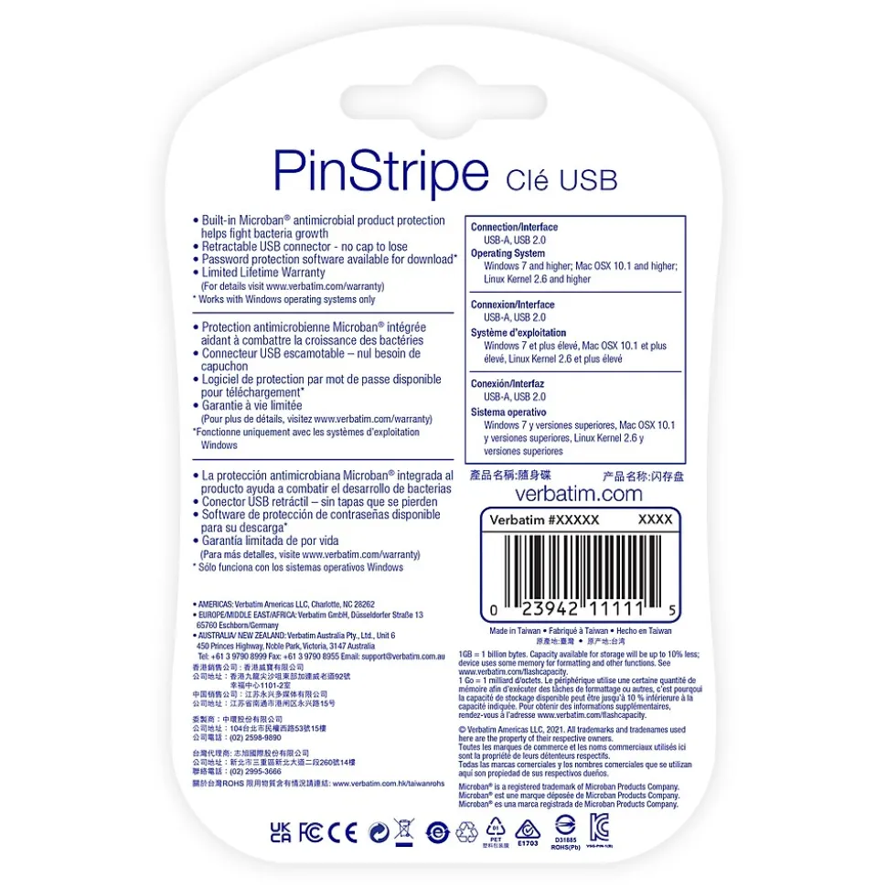 Portable and fast, ideal for all your storage needs! Available in a wide variety of colors and capacities, Verbatim® PinStripe USB drives make storing and organizing your important files quick and easy. The convenient cap-less design with retractable housing protects the USB connector and easily slides in and out. These Verbatim USB drives include built-in Microban® antimicrobial product protection. This antimicrobial technology helps prevent the growth of bacteria – keeping your USB drives cleaner! Disclaimers: Microban® is a registered trademark of Microban Products Company.