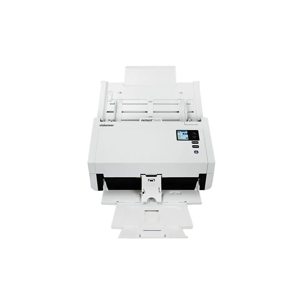 Built for paper-heavy work environments, the Visioneer® Patriot™ PH70 duplex color scanner does the heavy lifting, digitizing forms and documents quickly and accurately. With scan speeds of up to 70 pages (140 impressions) per minute, the Patriot™ PH70 has more horsepower (duty cycle of 11,000 daily scans) and handles more documents (up to 120 pages in the automatic document feeder) than any other scanner in its class. Visioneer’s Intelligent Software Platform takes the Patriot™ PH70 to the next level. It starts with Visioneer Acuity’s 25-point onboard image processing engine, delivering better quality scans at full speed. Visioneer OneTouch® allows for one-click scanning presets and easy walk-up scanning capability, while Visioneer Capture SE handles batch scanning, editing, as well as barcode reading and data extraction capabilities. Visioneer Organizer AI automates classification of common files and tagging for smarter search. And, with a full-version ABBYY® FineReader® PDF, take intelligent archiving to the next level with searchable PDFs, comprehensive multilingual Optical Character Recognition (OCR), deep PDF editing, file conversions, and security. Visioneer VAST Network brings end-to-end workgroup connectivity to the Patriot™ PH70, accommodating multiple users and delivering secure network scanning, while the Visioneer Mobile Capture app makes document capture, editing and secure sharing on a smartphone or tablet a reality. The Visioneer® Patriot™ PH70 delivers best-in-class value and is backed by Visioneer’s 3-year Standard Warranty. Combining performance, software and network/mobile scanning leadership, the Patriot™ PH70 is the solution for modern workgroup scanning.
