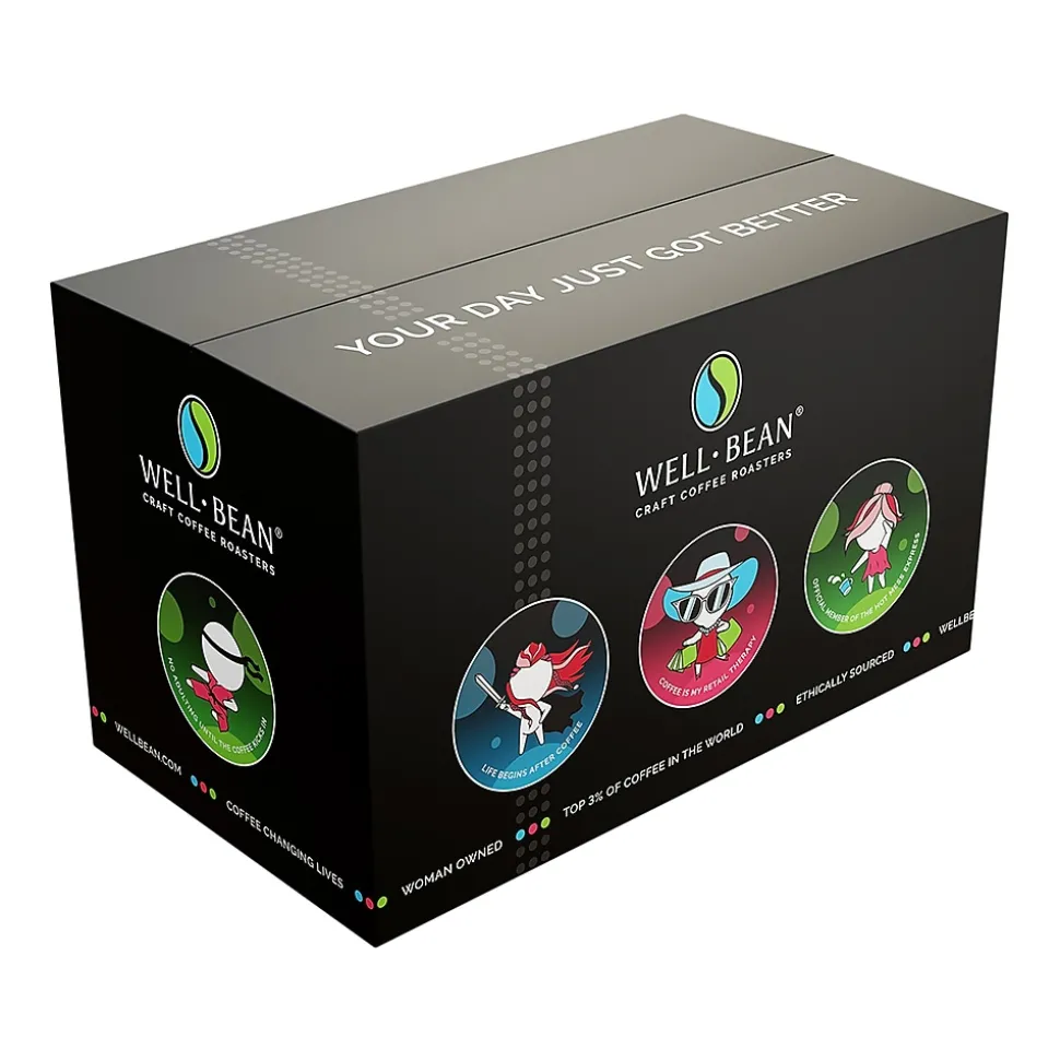 Well-Bean Coffee is a woman-owned and operated small-batch coffee roaster in Wake Forest, North Carolina. All coffee is roasted in batches of 85 lbs. or less to ensure an even roast and consistent taste and quality. Each pot pack is carefully roasted, ground, and packaged to the SCA Gold Cup standards. Hot Mess is 100% Nicaraguan, direct-trade, single-origin microlot coffee. Hot Mess is a specialty-grade, 100% arabica coffee with natural notes of cocoa, raw peanuts, and red apple. The carton contains 18 fractional packs dosed for a full pot of coffee, packaged in a fun, relatable design for an unforgettable coffee experience.