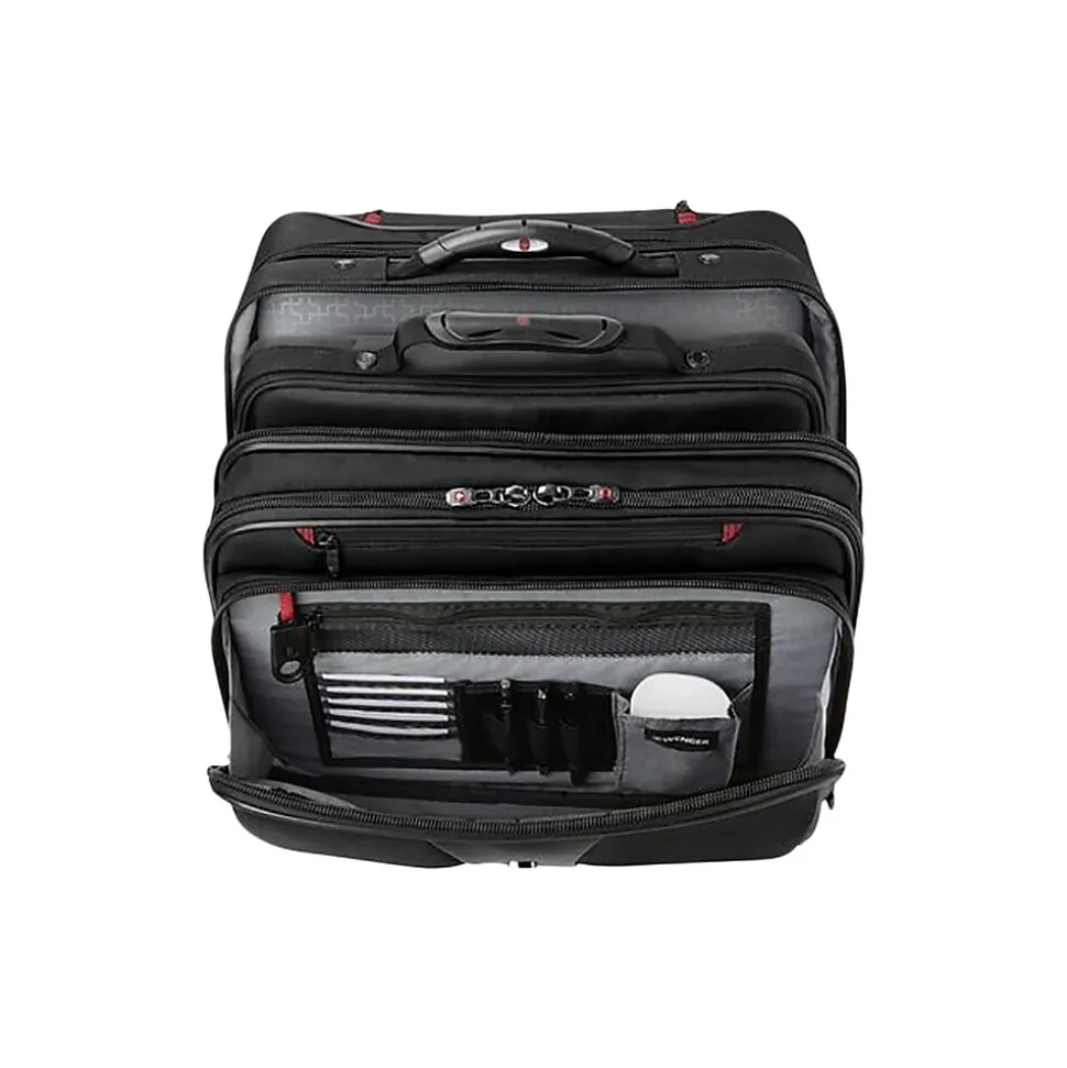 Increase the comfort of carrying a laptop while on business trips with this roller set. The Comp-U-Roller has a padded compartment that protects your laptop, while the removable slimcase enhances versatility and convenience. An ergonomic trolley handle makes this rolling case comfortable to carry all day long, and the easy-glide wheels enable easy movement. This Wenger Patriot II rolling case has an expandable file divider, which helps you organize documents.