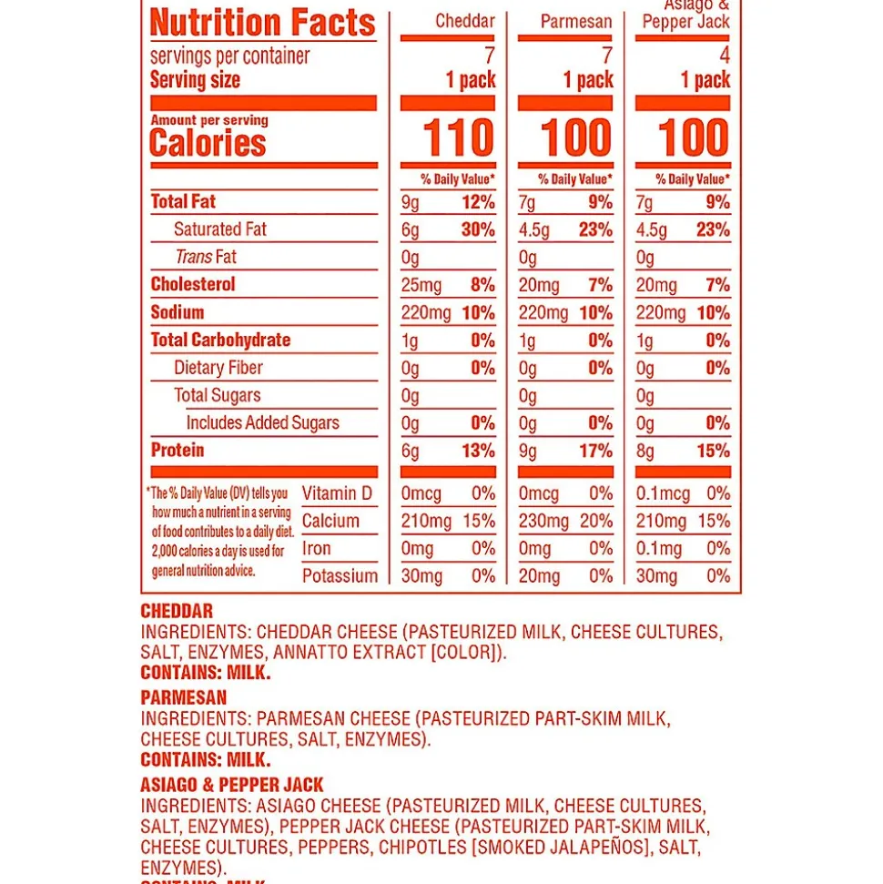 - Includes Parmesan (7 packs), Cheddar (7 packs), and Asiago Pepper Jack Snack Packs (4 packs)