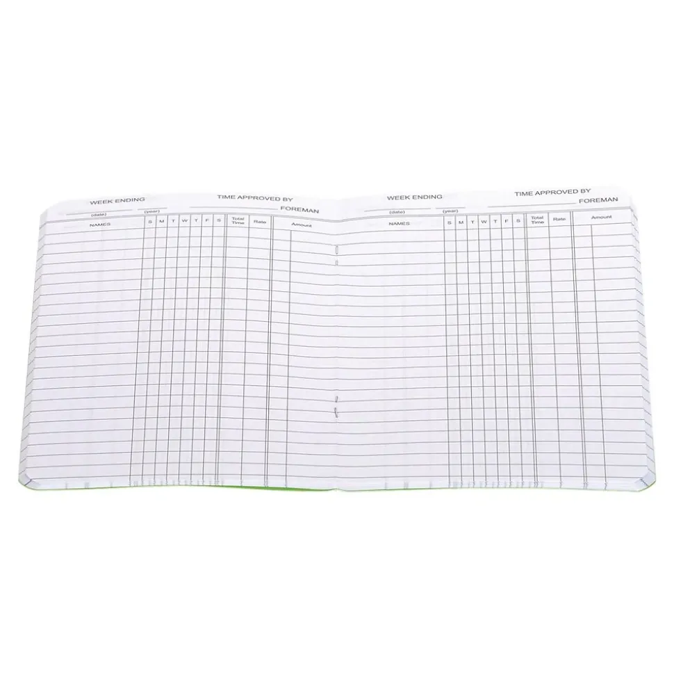 Log employee hours with this green time book. The book has 72 pages for long-term use, and the small pocket-size design makes it easy to carry on job sites. This Wilson Jones Foreman’s time book tracks hours for up to 23 employees, which is ideal for small business use.