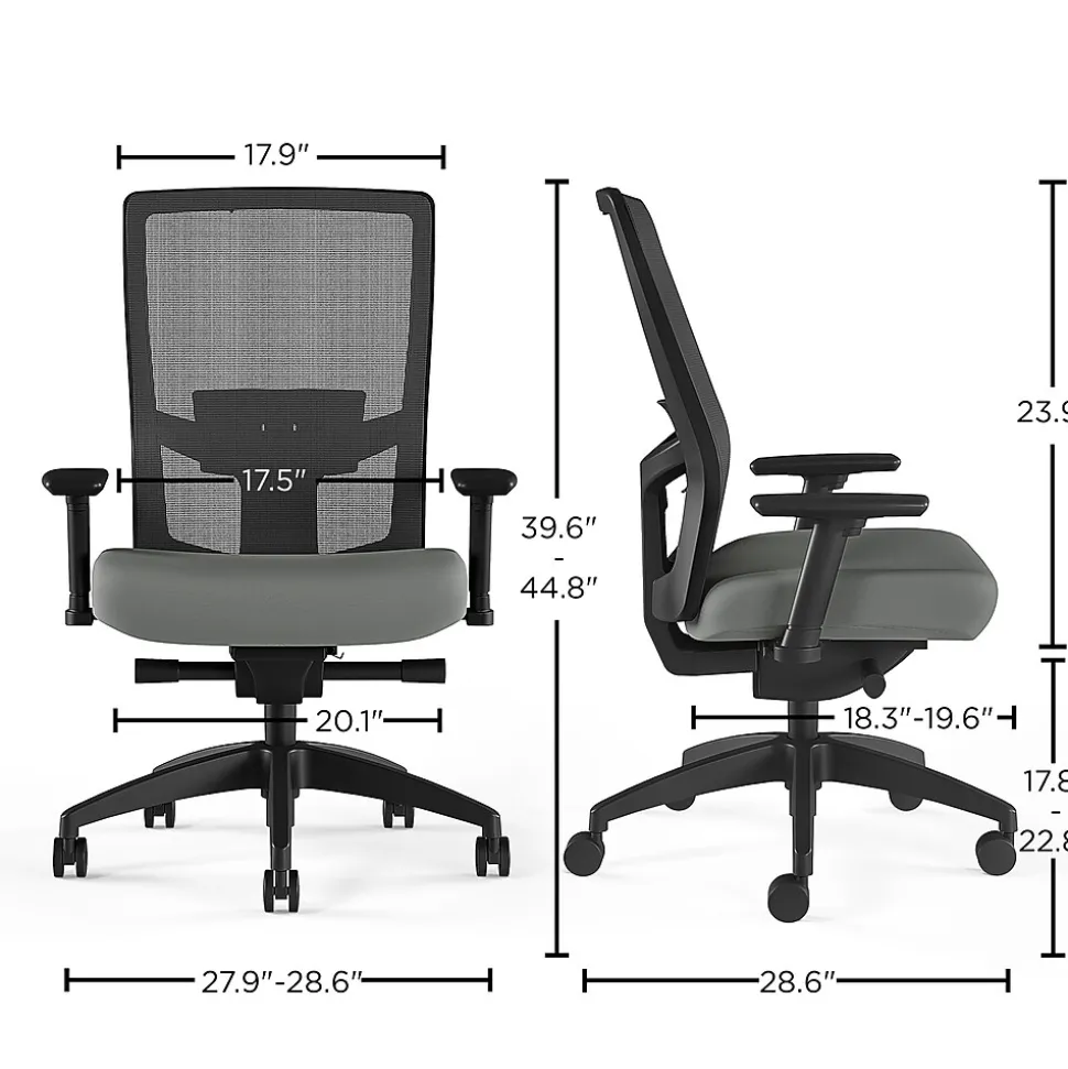 - Overall Dimensions: 39.6 – 44.8″ H x 27.9 – 28.6″ W x 28.6″ D ; Seat Depth: 18.3 – 19.6″, Seat Width: 20.1″, Seat Height: 17.8 – 22.8″, Back Height: 23.9″, Back Width: 17.9″