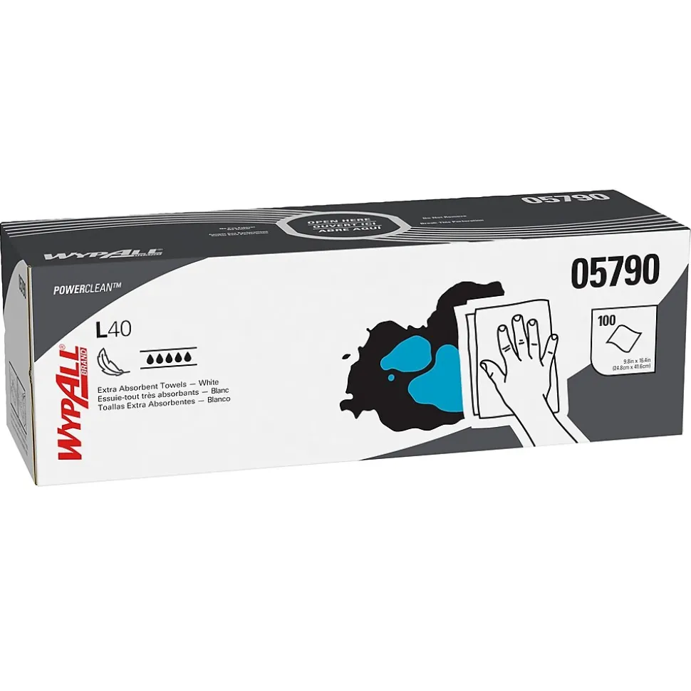 - 100 Sheets/Box; 9 Boxes of WypAll® PowerClean™ L40 Extra Absorbent Towels/Case; 900 Sheets/Case; White; Pop-Up Box; Limited Use Towels