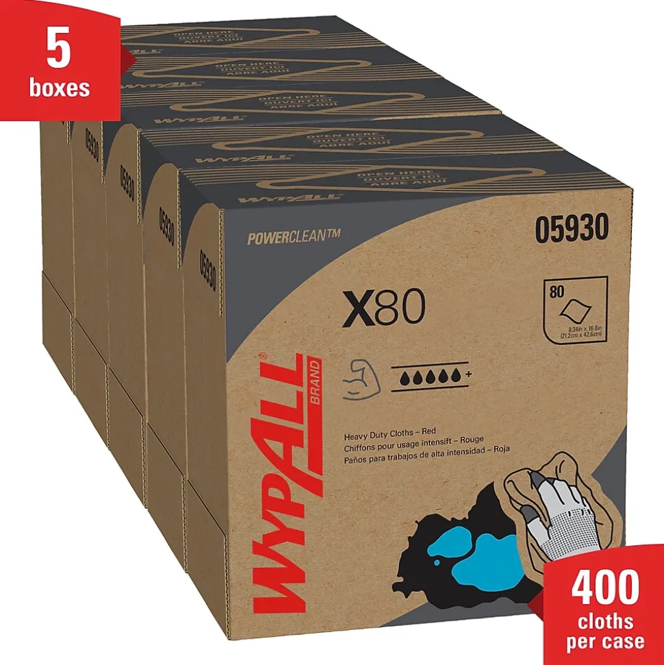 - 80 Sheets/Box; 5 Boxes of WypAll® PowerClean™ X80 Heavy Duty Cloths/Case; 400 Sheets/Case; Red; Pop-Up Box; Extended Use Towels